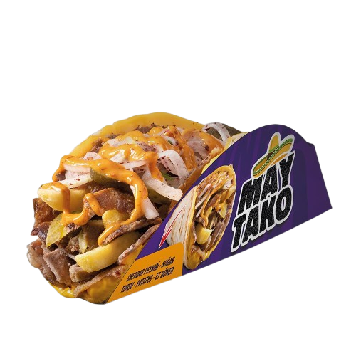 2 Adet Maytako (50 gr. tavuk döner, tortilla lavaş, chedar peyniri, salatalık turşusu, patates kızartması, soğan, acılı sarımsaklı mayonez sos.(tercihe bağlı) yanında paket cin biberi ile